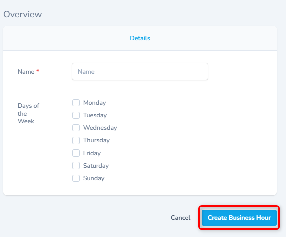 - Enter the name of the Business Hour, select the work days and click the Create Business Hour button to create a new record.