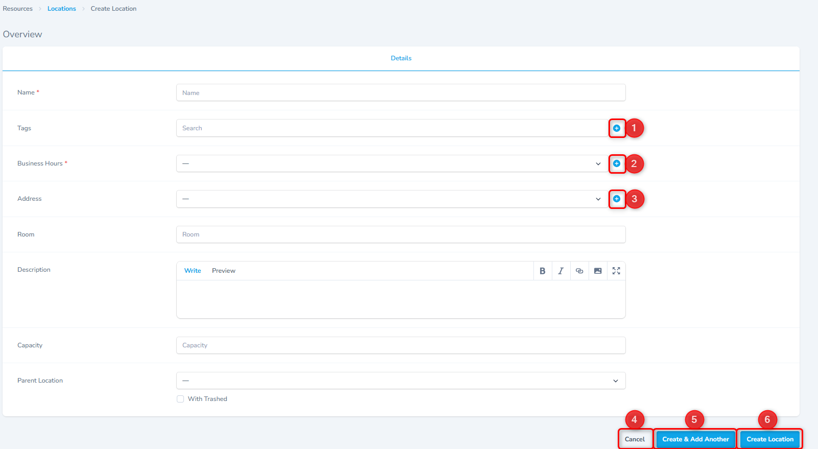 When adding multiple location, use the Create & Add Another function to add records more efficiently.