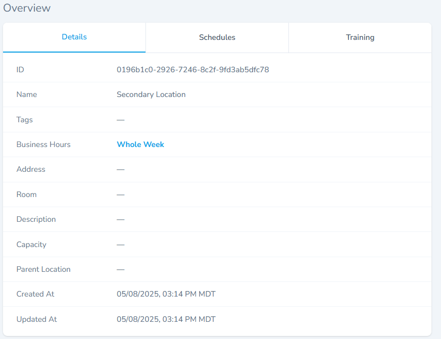 - The overview section has three tabs, Details tab, Schedules tab, Training tab.