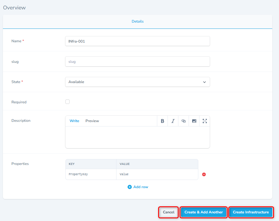 !!! tip "Tip" - When adding multiple Infrastructure, use the Create Create & Add Another function to add records more efficiently.