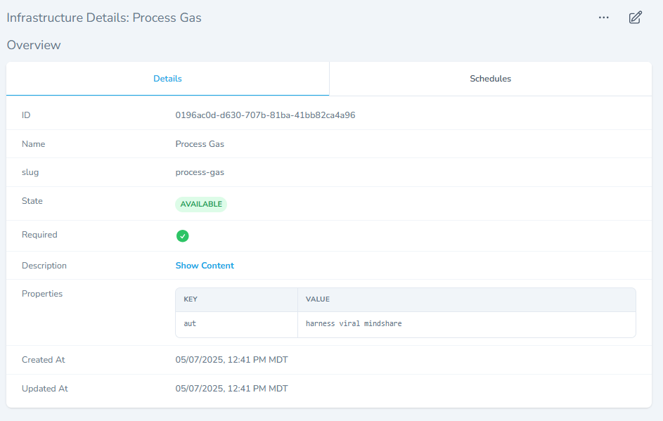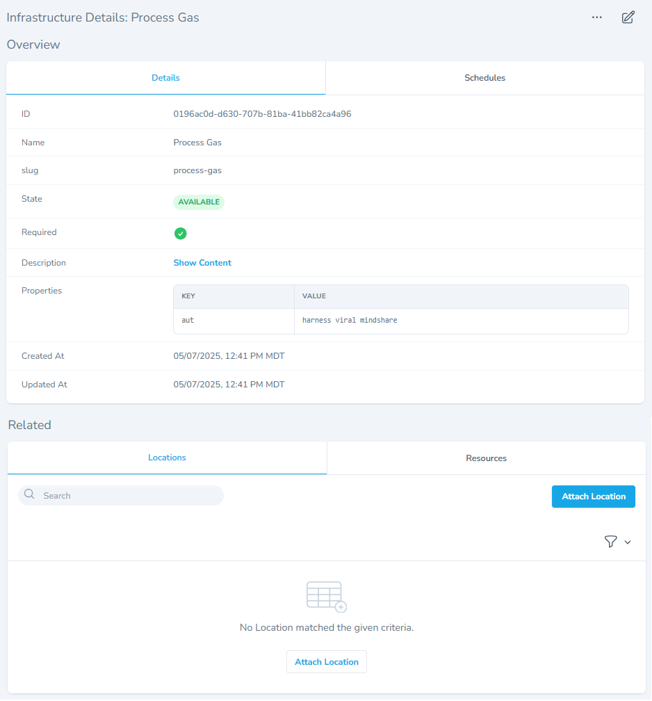 The Infrastructure feature allows you to define and manage the core components of your facility's operational setup. It displays crucial system parameters and connections as key-value pairs, providing an overview of your integrated devices and services. You can also add new infrastructure details, ensuring accurate representation and control over your connected environment.