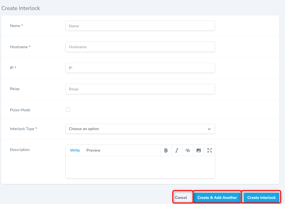 !!! tip "Tip" - When adding multiple Interlocks, use the Create Create & Add Another function to add records more efficiently.