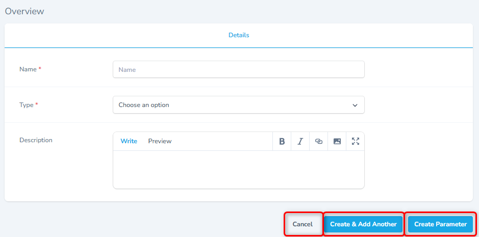 !!! tip "Tip" - When adding multiple Parameters, use the Create Create & Add Another function to add records more efficiently.