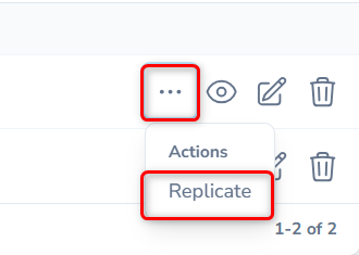 The Replicate function is available on all listing frames to streamline data entry. This utility allows you to quickly create a new record by duplicating an existing one. All fields from the original record are pre-filled, enabling rapid creation of similar entries with minimal manual input. Click the three dots (. . .) against a record in the listing frame to view this option, as shown below.