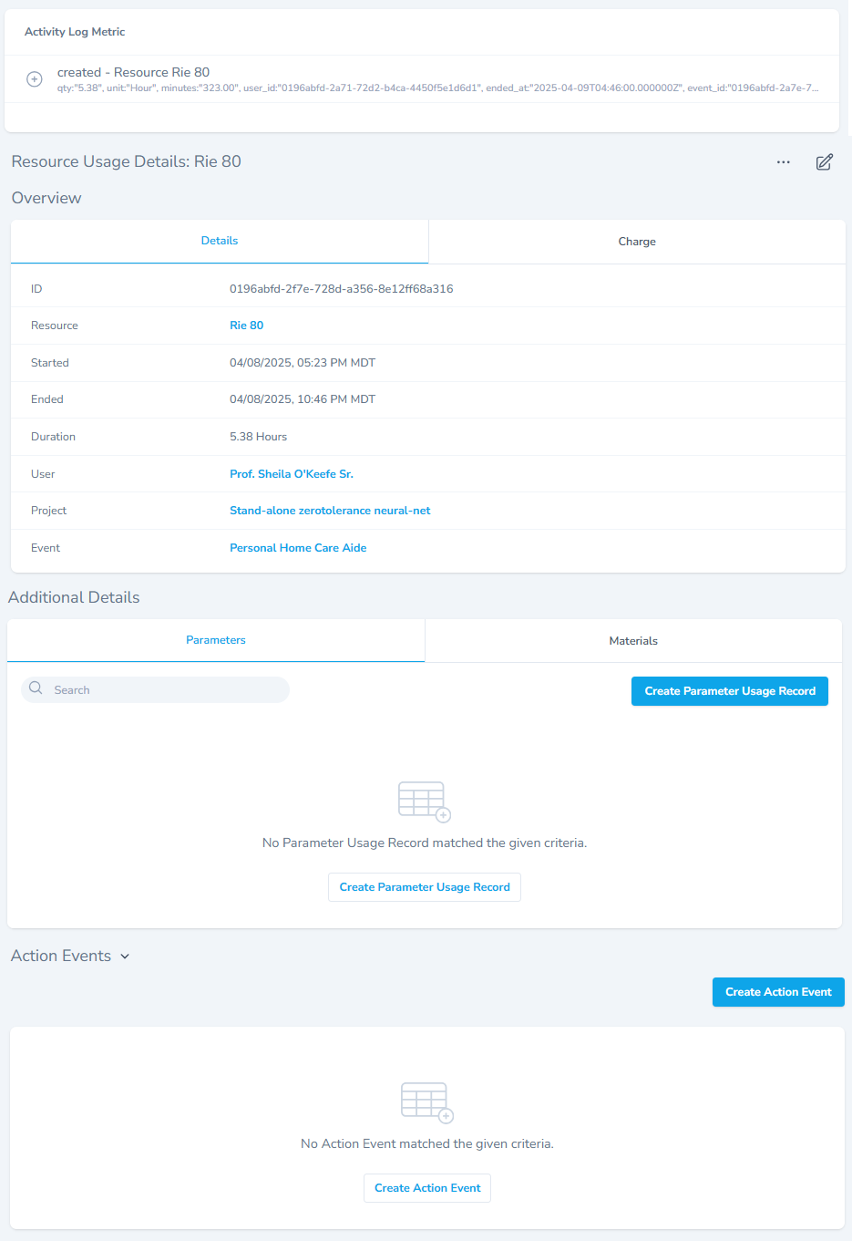 - The Action Events section allows users to create and attach Action Events to a resource.